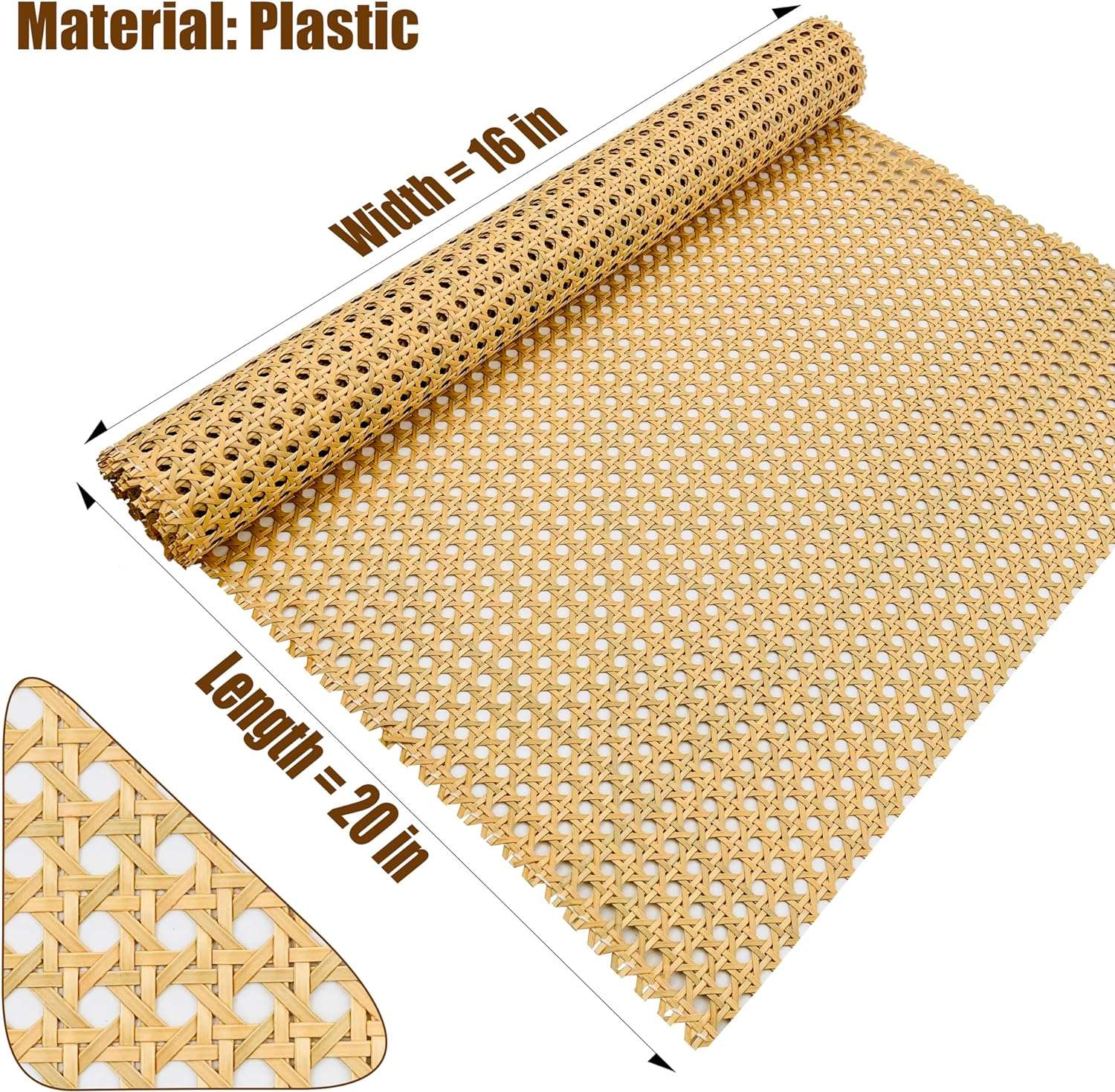 Plastic Rattan Webbing Roll, 16 Inch x 20 Inch, Handwoven Synthetic Poly Rattan, Faux Cane Mesh-Open Weave, Hexagonal Pattern, for DIY Home Decor Projects incl. Furnitures Chairs Cabinets Beds